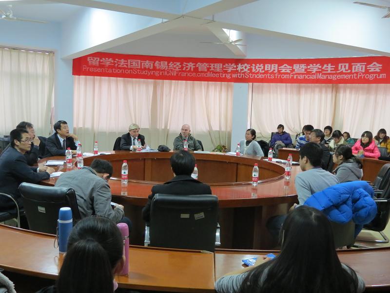 11月21日下午,法国南锡经济管理学校副校长Jean Claude Grass先生、Stanislas D’Eyrames博士一行两人来我校进行友好访问。经济与管理系40余名联合办学学生、外语系17名法语专业学生与法方代表在1#301会议室进行了交流。