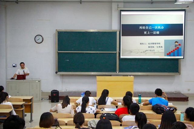 第五讲的主题是“再给自己一次机会,更上一层楼”。首先,王老师从学生到社会最终的走向谈起,介绍了专科学生毕业后发展的两个大方向:升学和就业,然后以具体数据论证了专科学生就业的压力和现实状况,同时举例说明更高学历层次的就业优势;从而引出,专科学生还有一次提升自己学历的机会:3+2专升本,通过专升本获得本科学历,再然后可以继续升学读研;对于专升本王老师以现实数据详细分析了我院近五年专升本情况,介绍了临沂大学、德州学院、泰山学院、山东女子学院、山东财经大学东方学院的近几年最低录取分数和招生人数等基本情况,解读了我省专升本招生考试情况和政策,为学生提供了详细的招生学校、专业、人数、分数线、考试科目、考试大纲、参考书目等数据信息;最后,鼓励同学们积极报名参加专升本考试,提升自己学历更上一层楼,并给出了自己的复习备考策略和建议。