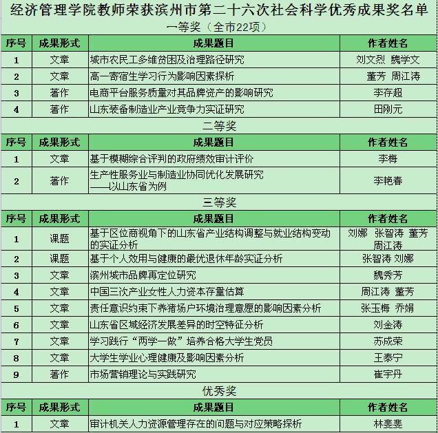 近日,滨州市第二十六次社会科学优秀成果奖评审结果揭晓,我院教师16项成果获奖。其中一等奖4项、二等奖2项、三等奖9项、优秀奖1项,获奖数量和质量创历年之最。