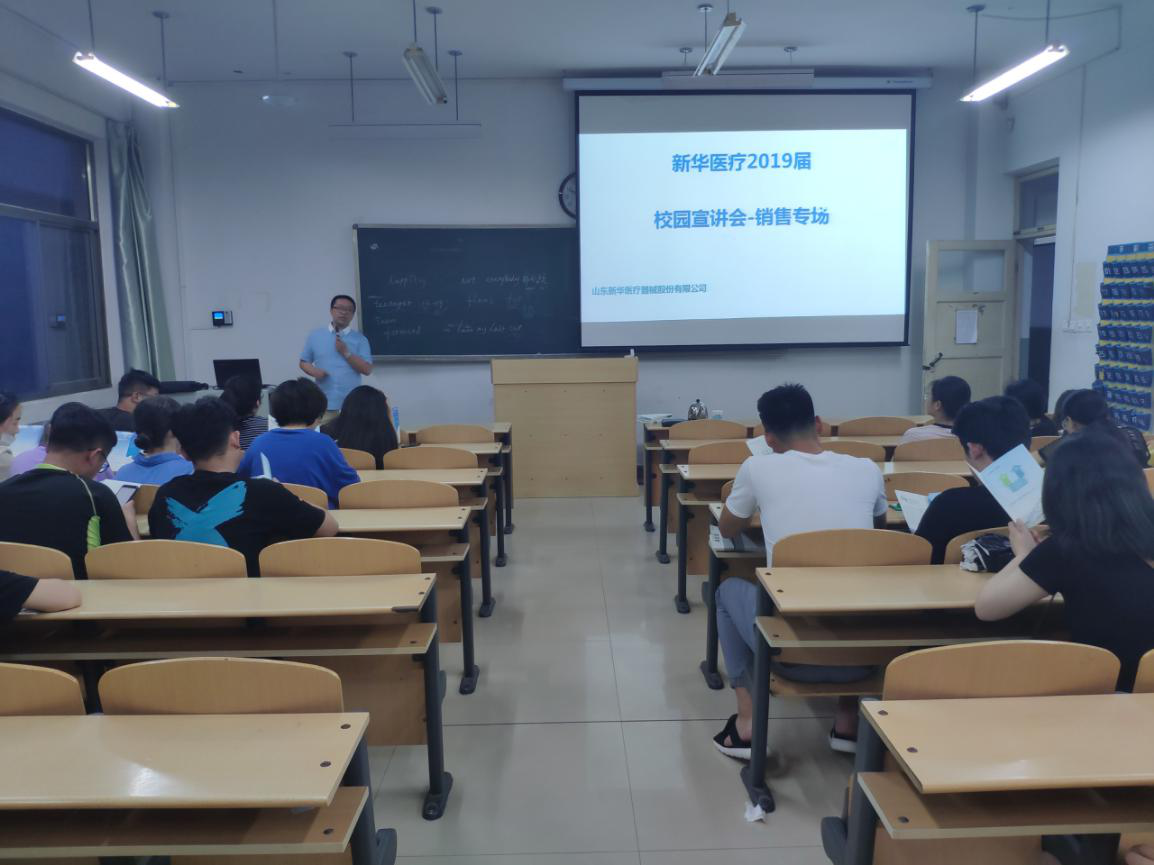 5月26日晚,新华医疗于7教301教室举办新华医疗2019届校园招聘宣讲会。91精品无码2019年部分应届毕业生参加了此次宣讲会,新华医疗公司的周经理为此次宣讲会的讲解人。