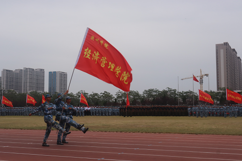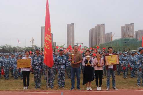 大会在雄壮的国歌声中拉开帷幕。伴随着雄壮的《义勇军进行曲》,鲜艳的五星红旗冉冉升起,全体师生向国旗致以崇高的敬礼。标兵就位,分列式开始。我院四个方队目光坚定,精神饱满,意气风发,迈着整齐划一的步伐、高喊着铿锵有力的口号,正步通过主席台接受检阅,展示训练成果。随后,整齐且有力的女子匕首操表演、男子刺杀操表演,赢得了全场热烈的掌声。最后,全体新生合唱《我和我的祖国》,献礼祖国70华诞,汇报表演在歌声中落下帷幕。分列式表演结束后,进行总结表彰大会,我院获得“优秀组织单位”、“内务卫生优胜连队”、“阅兵优胜方队”、“军容风纪优胜连队”、“阅兵优胜连队”共五个奖项,再创佳绩。大会结束后,我院领导、全体辅导员、学生会成员与2019级全体同学合影留念。