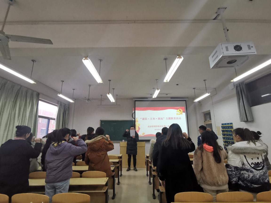 “人无信不立”。诚信是中华民族的传统美德,也是现代社会最基本的道德准则、社会主义核心价值观的重要内容和社会最基本的行为准则。在会上,党支部书记王胜组织学生党员认真学习了《滨州学院考试违规行为的认定与处理规定(试行)》以及《中华人民共和国刑法修正案(九)》第284条、《国家教育考试违规处理办法》等有关法律法规,并结合违反考试纪律的典型案例进行考试纪律教育,向党员们深刻讲解了诚信考试于个人而言、于家庭而言,乃至于社会而言的重要意义,教育党员诚信立身、诚信立学、诚信立行,树诚信之风,扬诚信之气。随后,全体党员围绕“诚信需不需要制度约束”、“大学生党员如何通过诚信来增强党性修养”等话题开展诚信大讨论,增强学生党员自我教育、自我完善的意识和决心,让“诚”字深深扎根在心间。会议最后,全体学生党员进行了诚信考试宣誓。