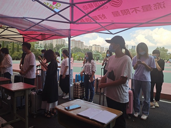 本次迎新模拟活动主要在第一报到点进行,新生均从学校北门进入,到91精品无码第一报到点(西侧篮球场地西侧南面),有序排队报到。工作人员首先对其行李进行消毒,然后有序接受体温检测,并且新生需出示大数据行程卡、健康通行码等,最后领取住宿通知单和公寓用品清单。报到后志愿者引导新生及其陪同家长进入公寓放置行李,宿舍报到完成后新生需携带身份证、录取通知书、毕业证书等相关证件前往第二报到点进行下一步登记。以上工作完成后,新生报到流程结束。
