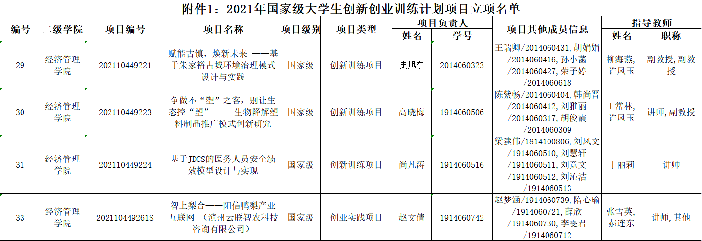 近日,2021年国家级、省级大学生创新创业训练计划项目评审结果揭晓,经管学院立项国家级项目4项,省级项目10项,校级项目74项,共计88项。获奖数量和质量创历年新高。其中,柳海燕,许凤玉老师指导的《赋能古镇,焕新未来 ——基于朱家裕古城环境治理模式设计与实践》、王常林,许凤玉老师指导的《争做不“塑”之客,别让生态控“塑” ——生物降解塑料制品推广模式创新研究》、丁丽莉老师指导的《基于JDCS的医务人员安全绩效模型设计与实现》、张雪英,郝连东老师指导的《智上梨合——阳信鸭梨产业互联网 (滨州云联智农科技咨询有限公司)》获批国家级大学生创新创业训练计划项目。