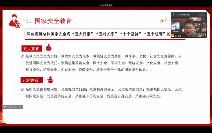 2022年4月15日是 《中华人民共和国国家安全法》颁布实施以来的第7个全民国家安全教育日。各年级以国家安全为切入点,分别围绕以下四个内容开展,一是关于全民国家安全教育日,王贝贝老师生动形象的利用PPT展示了全民国家安全教育日的由来;二是总体国家安全观,王胜老师对总体国家安全观的“五大要素”“五对关系”“十个坚持”“五个统筹”的深刻内涵进行了深入浅出的讲解;三是了解破坏国家安全的行为,提醒学生参加间谍组织、窃取国家机密、策动叛变等行为都属于破坏国家安全的行为,并且大家在遇到破坏归家安全的行为时应积极拨打国家安全机关受理公众和举报电话12339;四是维护国家安全,从每个人做起,各年级辅导员老师利用PPT展示生动鲜活的实例讲解了国家安全与我们的关系,让学生对维护国家安全等法律法规常识进一步了解。