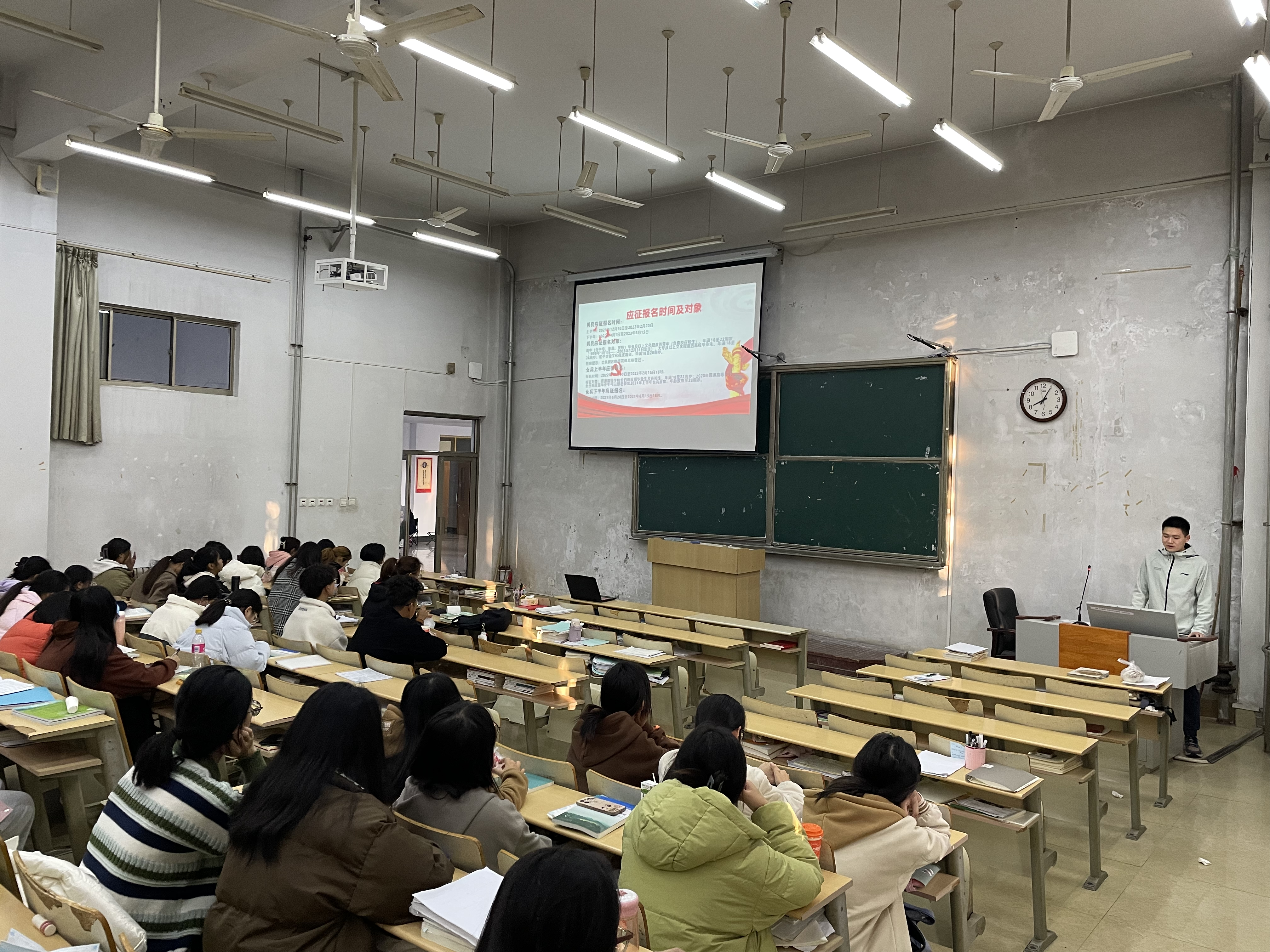 会议开始,刘彬老师强调本次活动举办的目的是在征兵事宜基本完备的条件下,对学生征兵工作的再动员。征兵工作事关祖国国防和军队的建设,是国家赋予高校的神圣责任,也是各院校人才培养工作的有效渠道,高校征兵目的是为大学生士兵提供更多经济和发展上的帮助。随后,优秀退伍复学学生张宁波结合自身入伍经历,从当兵的好处、当前当兵政策、当兵对未来的影响和当兵的意义四个方面分享入伍体会,并对退役复学后的学校相关政策做了详细讲解。最后,他呼吁广大青年学子要切实增强自身的责任感与使命感,自觉将个人理想与国家发展相结合,用热血与青春书写无悔人生。