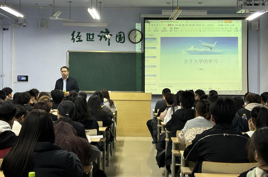 王春晖院长以目前新生学习生活中出现的问题为切入点,从如何适应大学的学习,大学学什么以及如何规划自己的学习等方面,并结合自身的工作和求学经历,向在场师生讲述了作为当代大学生应该从哪些方面着手培养自己的能力,成为祖国的栋梁之才和社会主义的合格建设者。