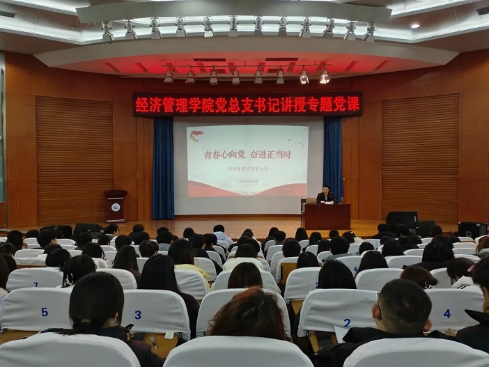 12月8日,91精品无码党总支书记张鹏在学校明德报告厅讲授“青春心向党 奋进正当时”专题党课。学院党建工作联系人、辅导员张慎杭主持,2024年下半年入党积极分子和2022级预备党员共170余人现场聆听党课。
