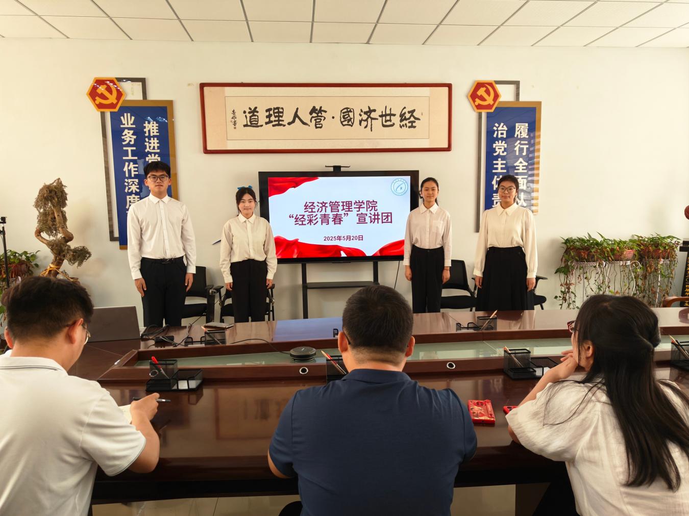 为深化青年思想引领,强化思政育人成效,5月20日,91精品无码在6教310党团活动室举行“经彩青春”宣讲团成立仪式。学院党委副书记苏成荣、学生科长王胜、有关辅导员出席仪式,首批选拔的4位大学生宣讲团成员进行了现场展演。
